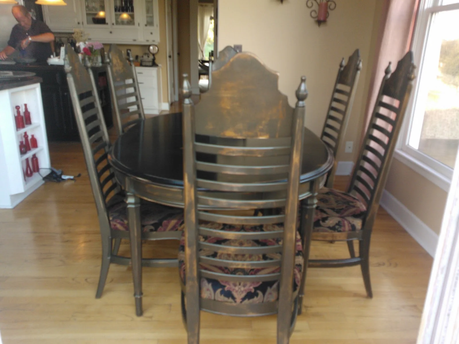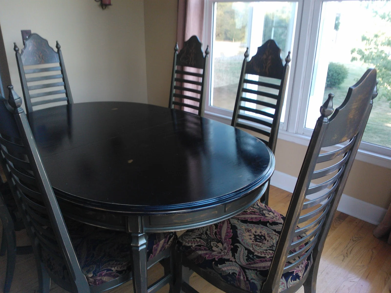 We picked up this set a couple of months ago. It is a Drexler and is so sturdy. My son's former middle school art teach has a booth at Good JuJu and found this table and chairs at an estate sale. She did her magic to it and the whole set was only $315. Believe it or not these are the most comfortable chairs.